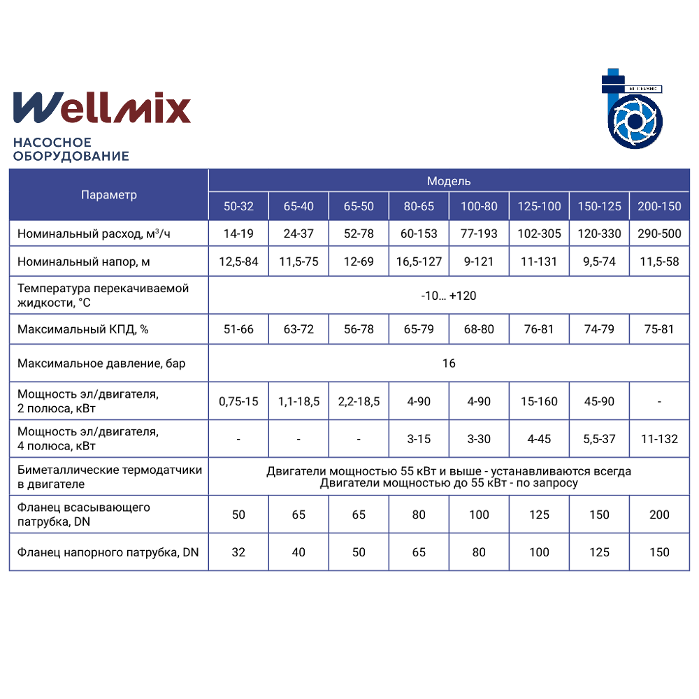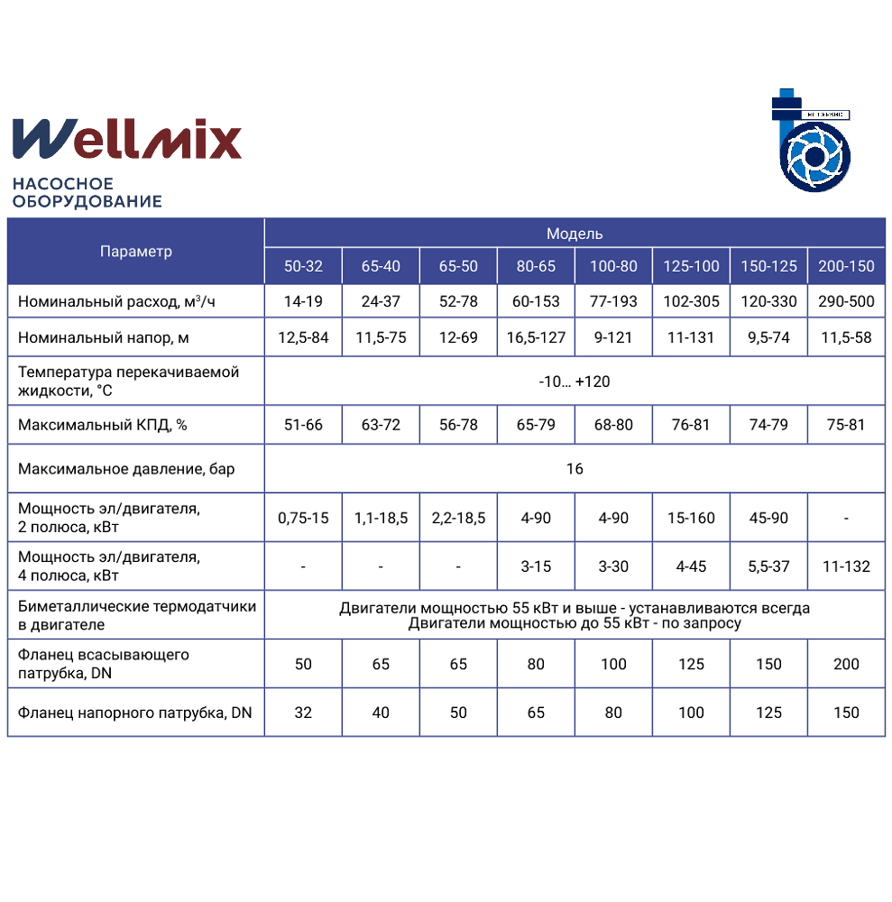 - Проточная часть: Рабочие колеса из чугуна/нержавеющей стали. Гидравлически разгруженная конструкция с увеличенным входом. Оптимизирована методами CFD.
